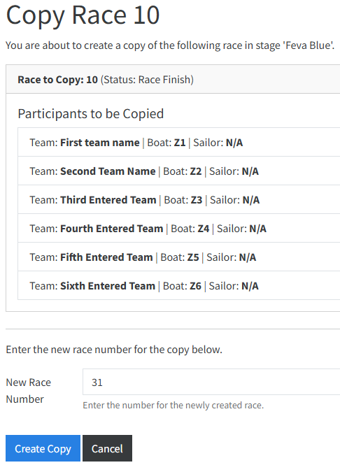 This will then allow you to check the Participants and Boats to be copied and set a new Race Number. The screen will suggest a Race Number that is 1 higher than the highest race number currently created.