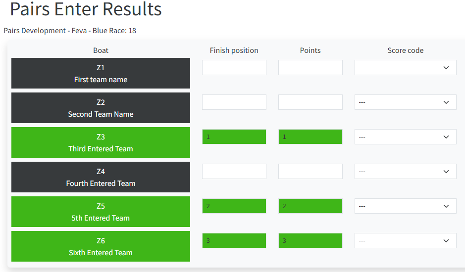 As each boat crosses the finish line click/tap the button for each boat, they will turn green and automatically insert the Finish Position and Points. The buttons show the boat name and crew/team name.
