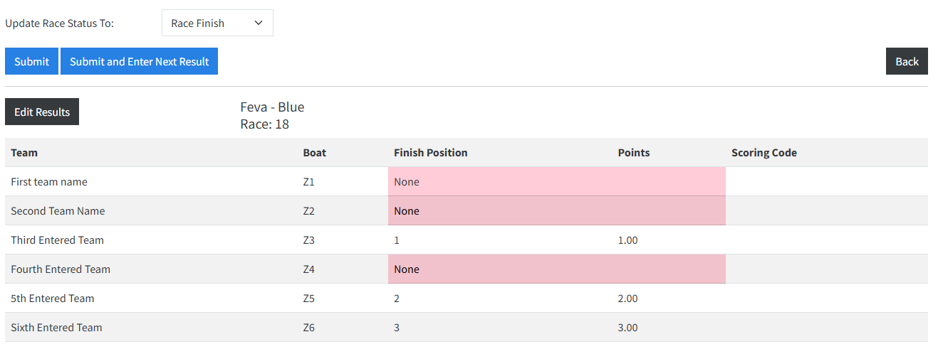This page will check the results for any errors (missing points etc.). The race cannot be marked as finished until all errors are fixed. If the results need editing, please click the Edit Result button to return to the first page.