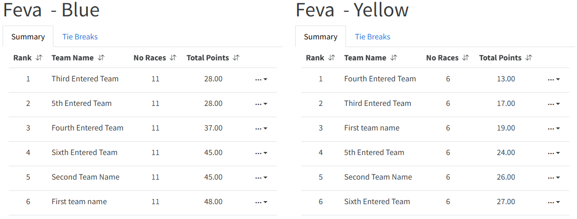 The Overall Result Summary calculates the points achieved by teams across all divisions.