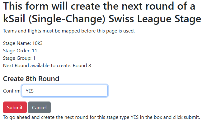 It is possible to generate the next round +1 any time after the final race within a round has been completed. To alert you to the option to create a new round, a message will be displayed at the top of the result confirmation (update race status) page.