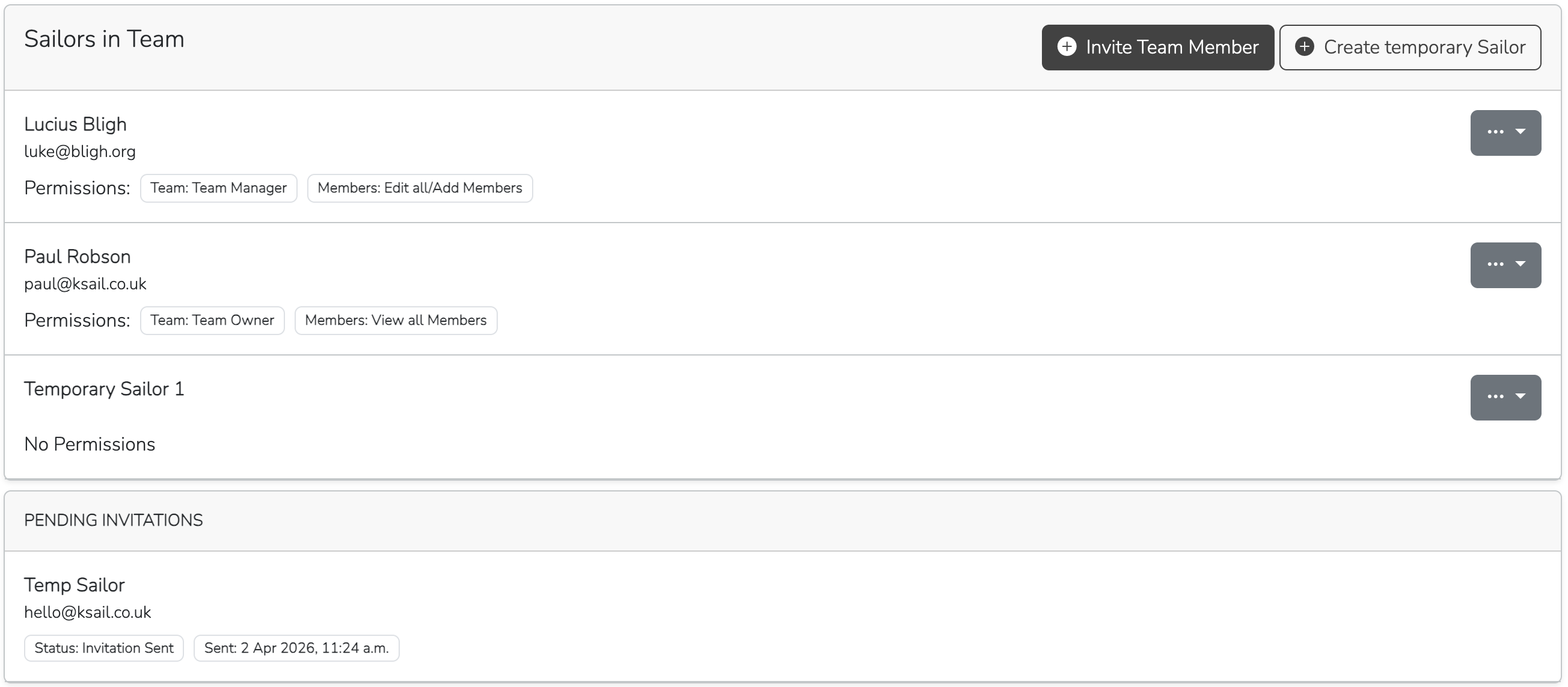 At the bottom of the Manage Team page, The Sailors in Team section shows the current members, temporary sailors, and pending invitations.