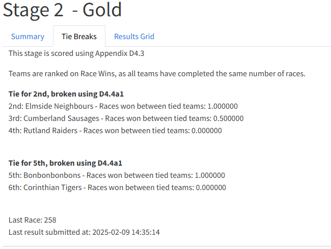The kSail Events Results Service provides an event with multiple options for how to break ties for a range of Team Racing scheduling and format options. The following Tie Breaking formats for Team Racing are included within the System. Round Robins- ...