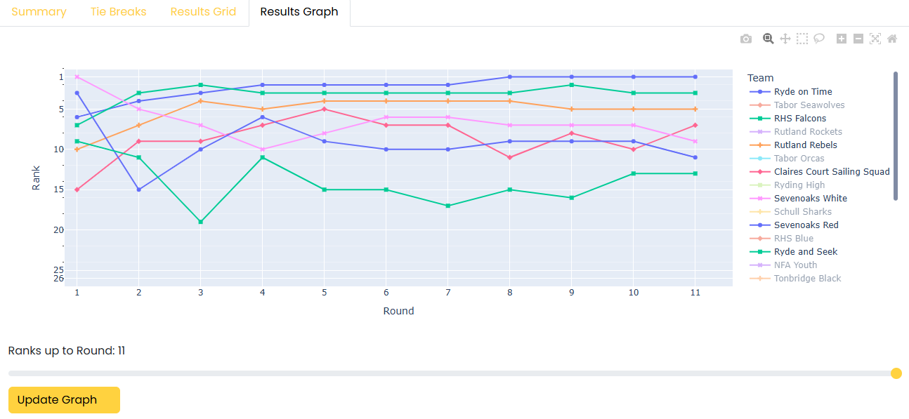 Automatically generated race schedule with only one team changing after each race Results and Rankings updated after every race entry Clear tiebreak information Results Grid showing matches between teams Graphs of team progress which allow ...