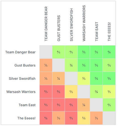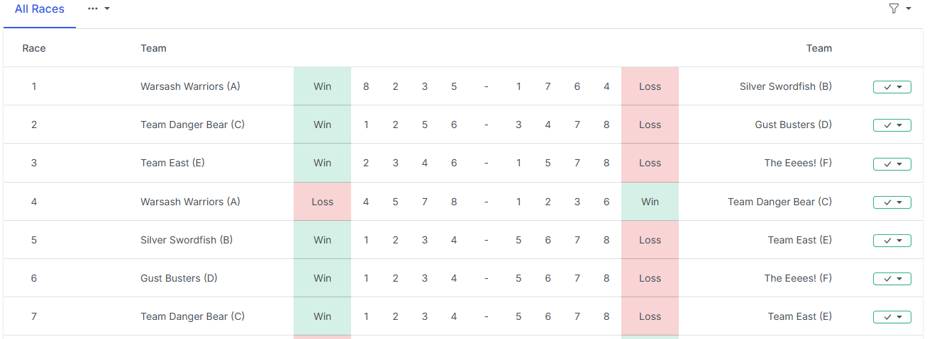 Automatically generated race schedule with only one team changing after each race Results and Rankings updated after every race entry Clear tiebreak information Results Grid showing matches between teams Graphs of team progress which allow ...
