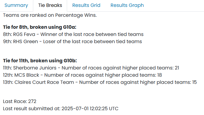 The kSail Events Results Service provides an event with multiple options for how to break ties for a range of Team Racing scheduling and format options. The following Tie Breaking formats for Team Racing are included within the System. Round Robins- ...